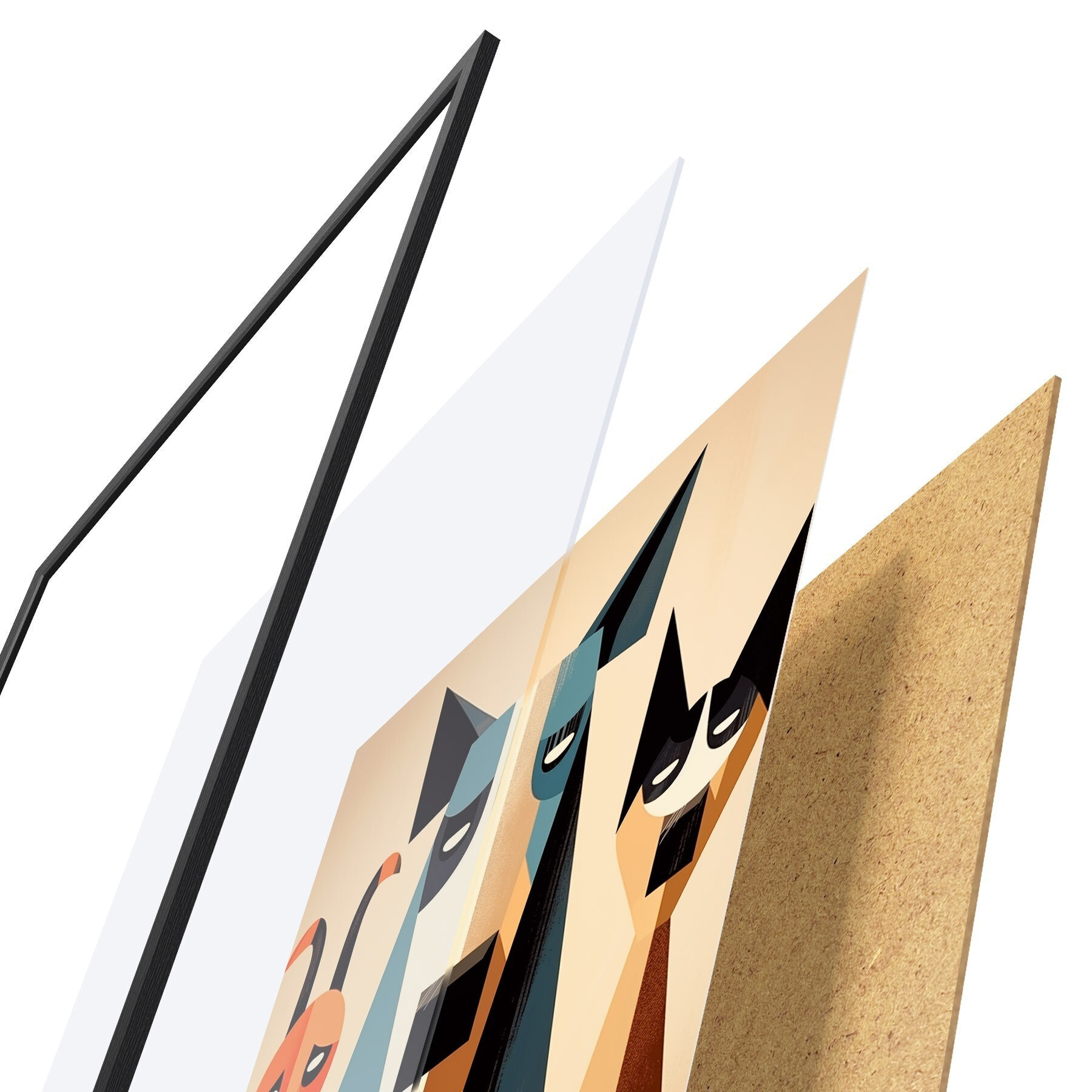 L’affiche encadrée est composée d’un cadre, d’un plexiglas, d’une image imprimée et d’un support en aggloméré. Elle est prête à être accrochée au mur grâce aux fixations situées à l’arrière.