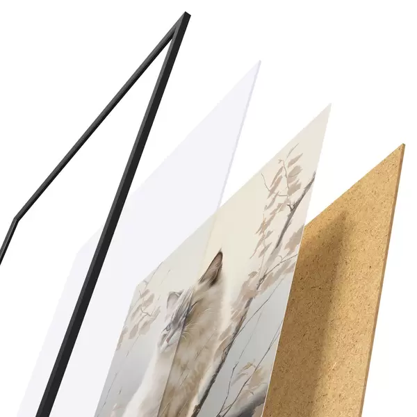 L’affiche encadrée est composée d’un cadre, d’un plexiglas, d’une image imprimée et d’un support en aggloméré. Elle est prête à être accrochée au mur grâce aux fixations situées à l’arrière.