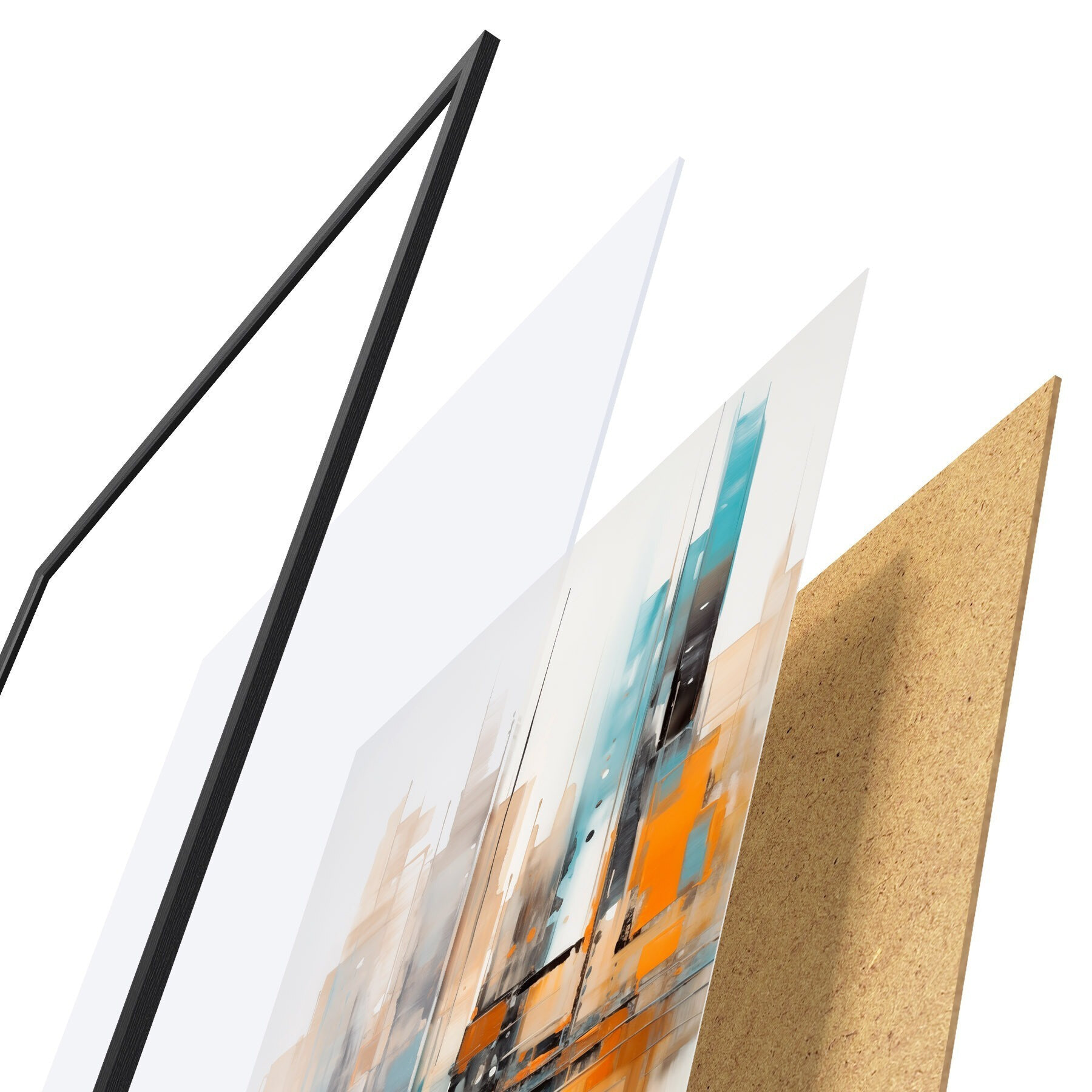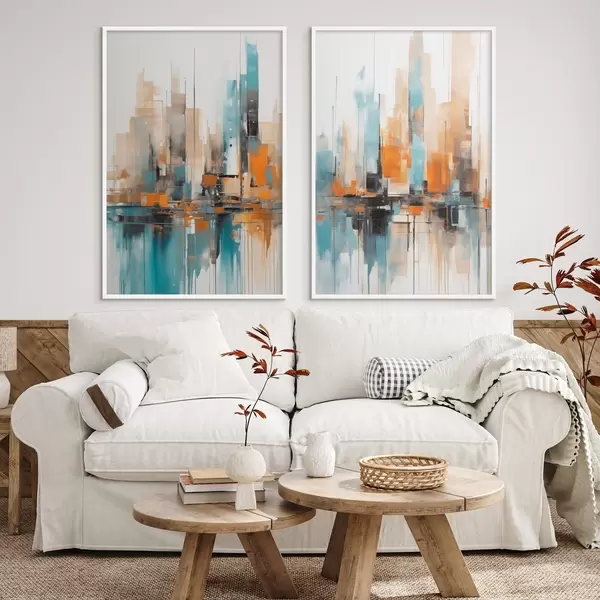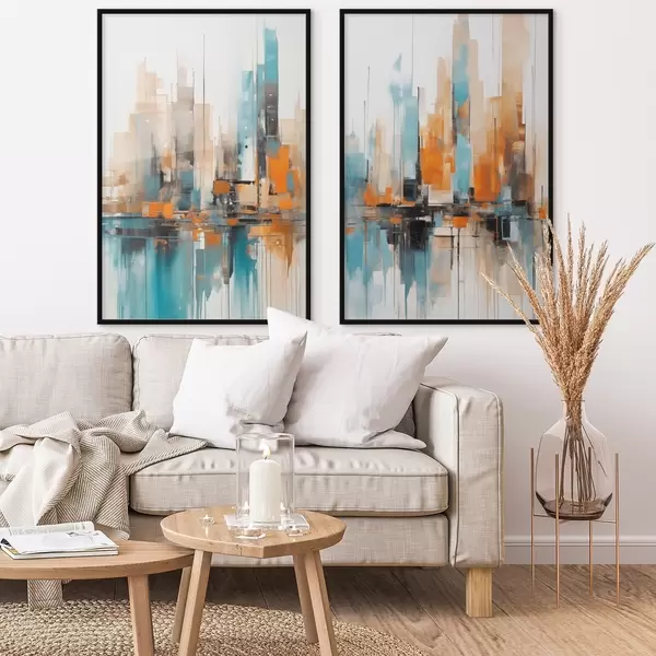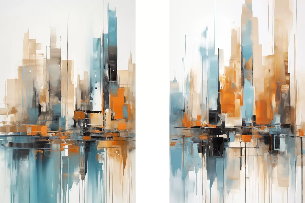 Poster Paysage urbain abstrait avec des coups de pinceau verticaux dans des tons orange, bleu et blanc, style pictural Nr d00876