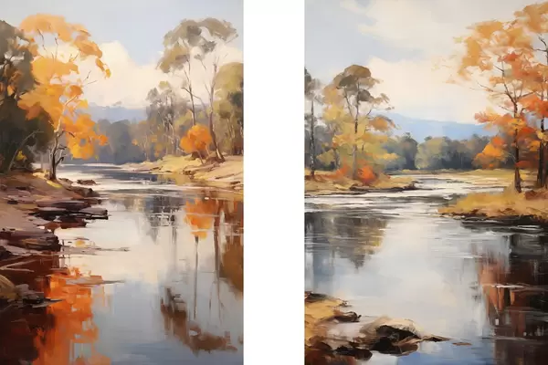 Poster Paysage automnal, rivière bordée d'arbres, forêt en arrière-plan, reflets sur l'eau Nr d00883
