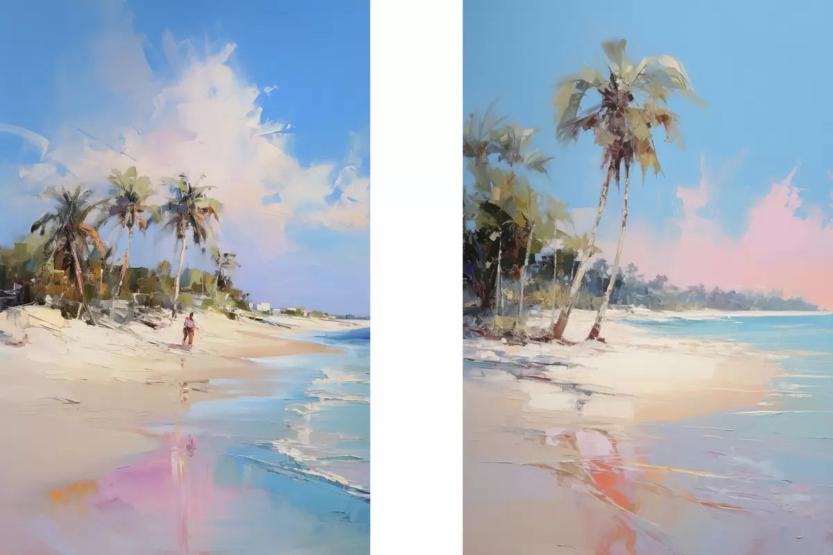 Poster Paysage abstrait, une plage avec des palmiers, une journée ensoleillée avec un ciel bleu et quelques nuages Nr d00885