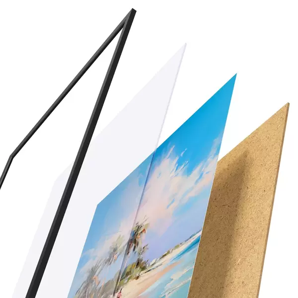 L’affiche encadrée est composée d’un cadre, d’un plexiglas, d’une image imprimée et d’un support en aggloméré. Elle est prête à être accrochée au mur grâce aux fixations situées à l’arrière.