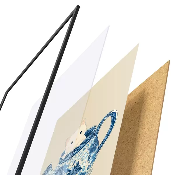 L’affiche encadrée est composée d’un cadre, d’un plexiglas, d’une image imprimée et d’un support en aggloméré. Elle est prête à être accrochée au mur grâce aux fixations situées à l’arrière.