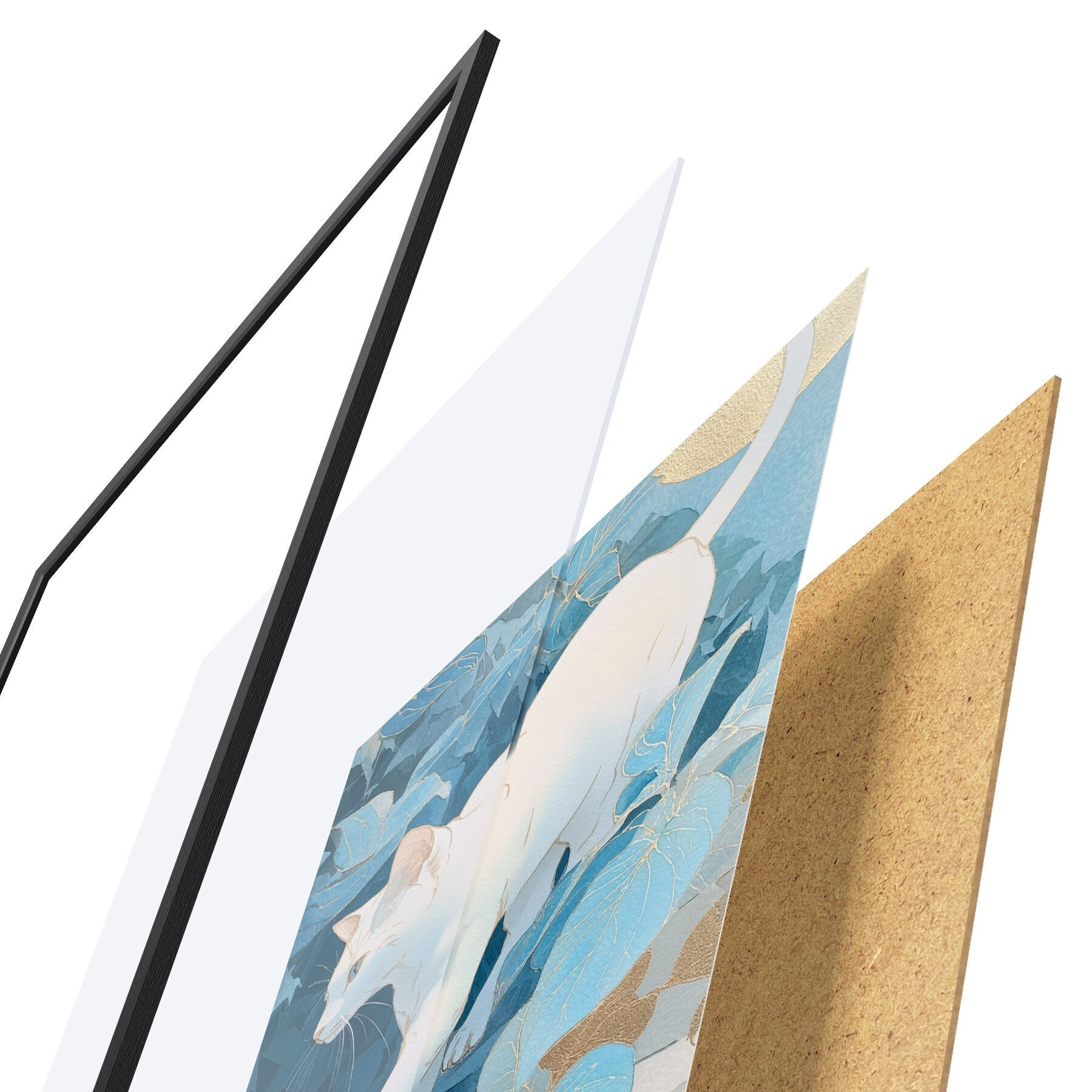L’affiche encadrée est composée d’un cadre, d’un plexiglas, d’une image imprimée et d’un support en aggloméré. Elle est prête à être accrochée au mur grâce aux fixations situées à l’arrière.