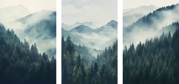 Poster Des montagnes brumeuses couvertes de pins, parsemées de tons verts et bleus doux. Nr d00964