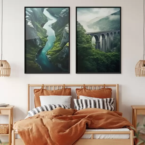 Poster Canyon aérien et viaduc brumeux dans les collines verdoyantes Nr d00967