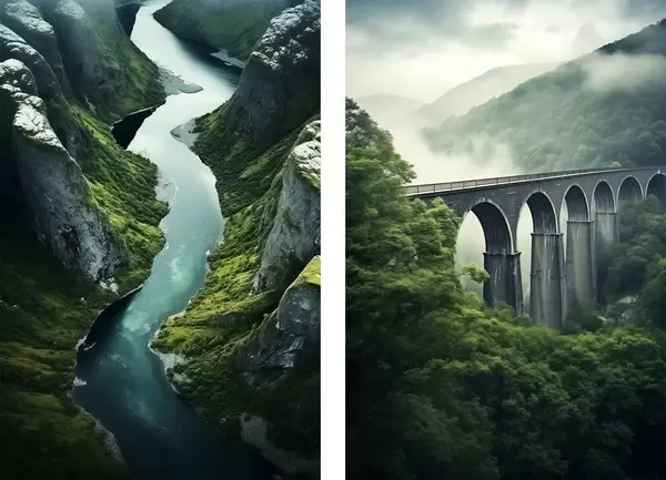 Poster Canyon aérien et viaduc brumeux dans les collines verdoyantes Nr d00967
