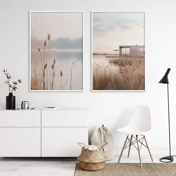 Poster Des roseaux souples au bord d'un lac calme et une cabane moderne sur la rive Nr d00970