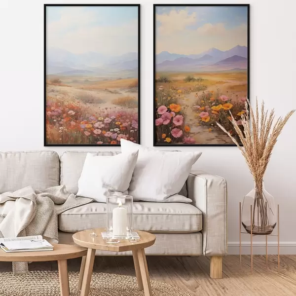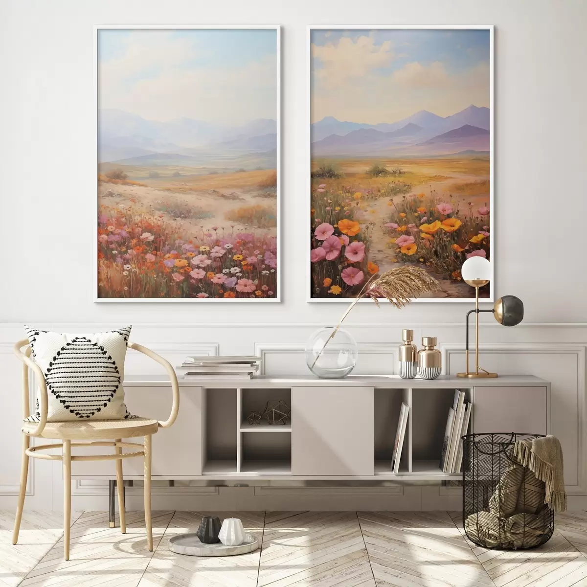 Poster Paysage, champ de fleurs colorées avec des montagnes en arrière-plan, couleurs douces et pastel Nr d01003