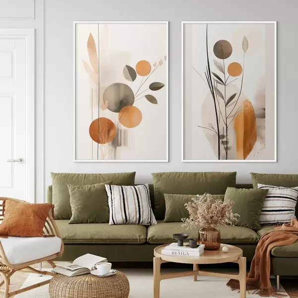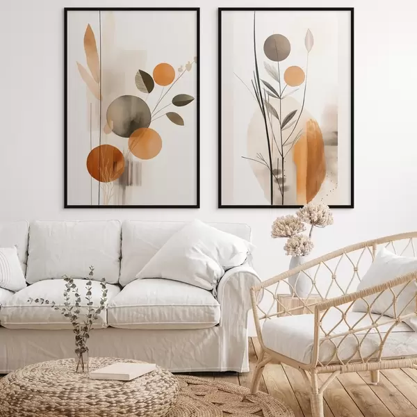 Poster Imitation de peinture abstraite avec des cercles orange et gris, des feuilles et des branches, style moderne, effet aquarelle Nr d01009