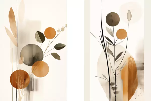 Poster Imitation de peinture abstraite avec des cercles orange et gris, des feuilles et des branches, style moderne, effet aquarelle d01009
