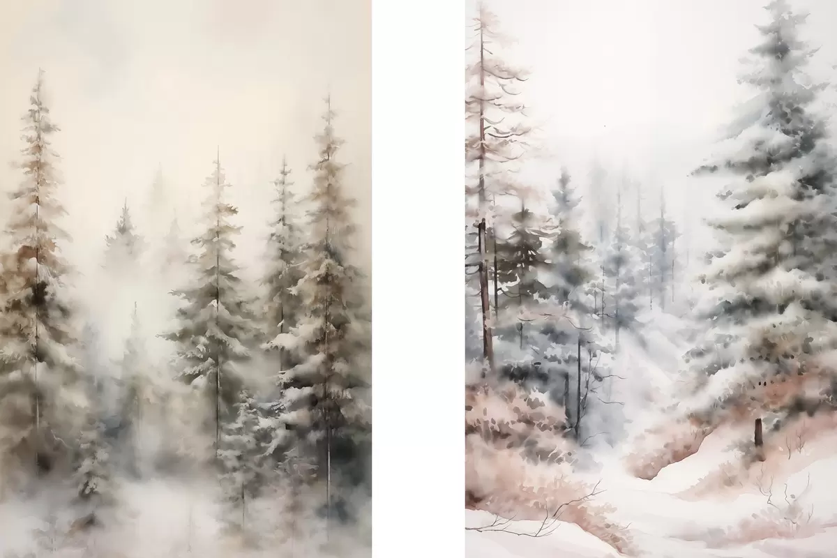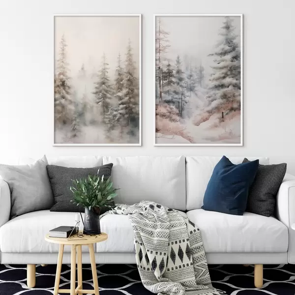 Poster De grands pins recouverts de neige, dressés dans une forêt brumeuse, une scène hivernale douce et feutrée. Nr d01011