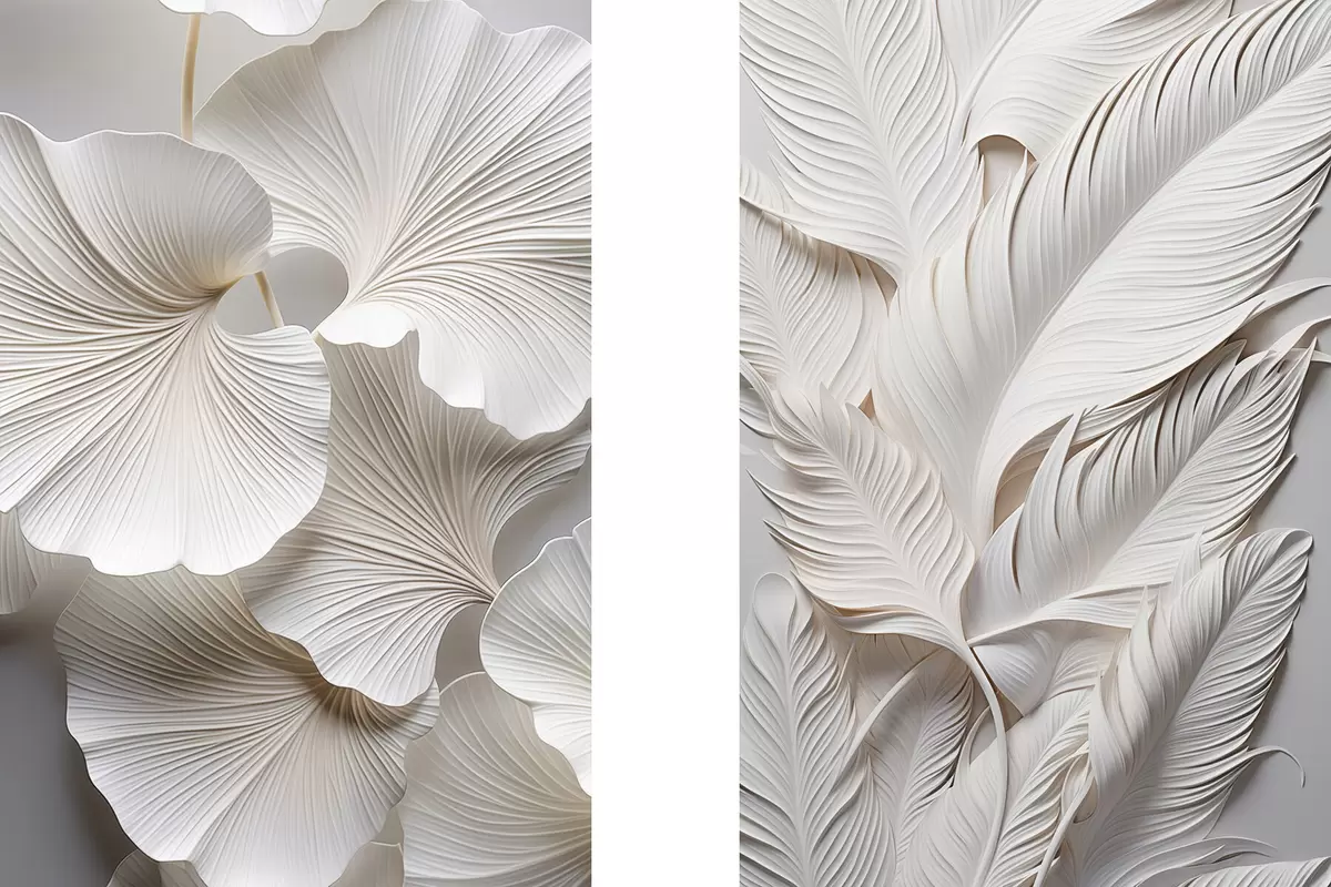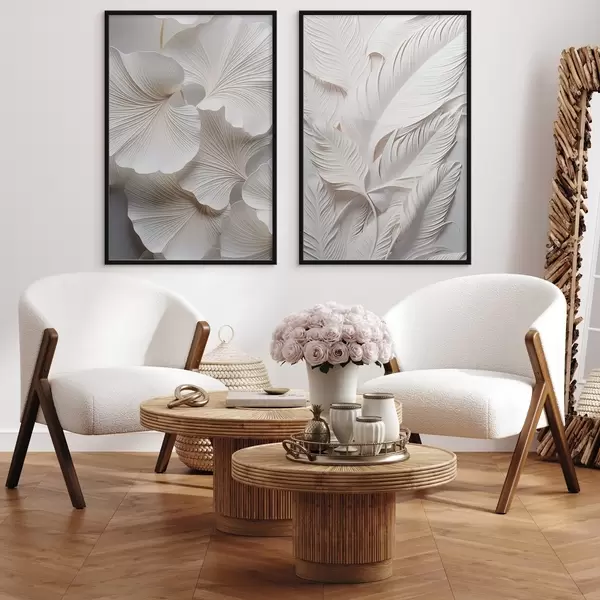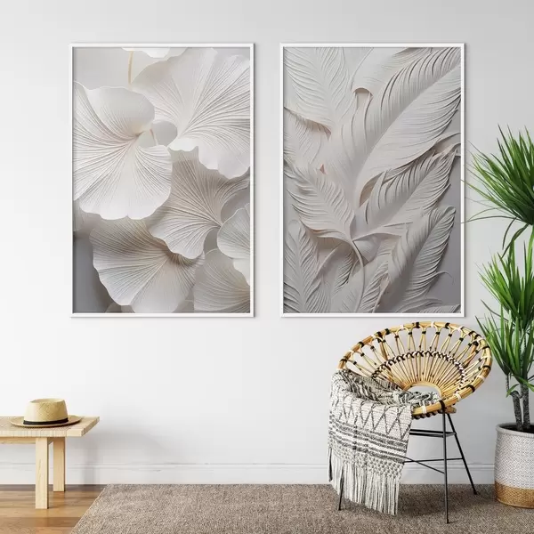Poster Feuilles de ginkgo blanches et longues feuilles aux détails complexes, créant un effet texturé et stratifié, art minimaliste. Nr d01013