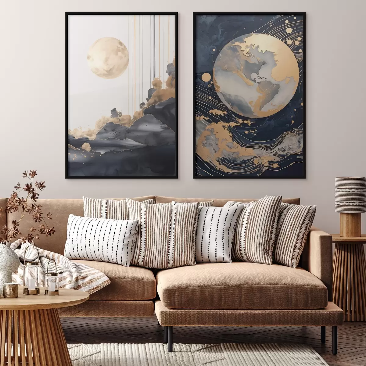 Poster Planète décorative texturée dans l'espace avec des lignes et des points jaunes, style abstrait, minimaliste et moderne d01014