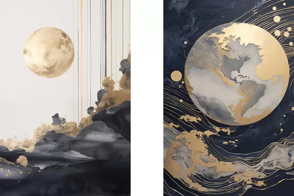 Poster Planète décorative texturée dans l'espace avec des lignes et des points jaunes, style abstrait, minimaliste et moderne d01014