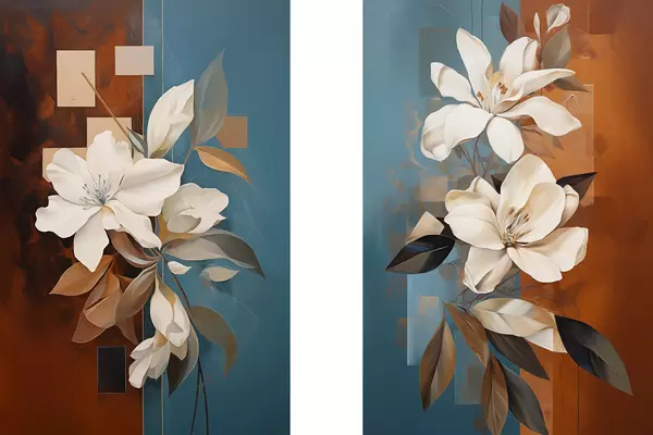 Poster Fleurs et feuilles blanches abstraites sur fond brun et bleu avec des formes abstraites, dans un style minimaliste. d01015
