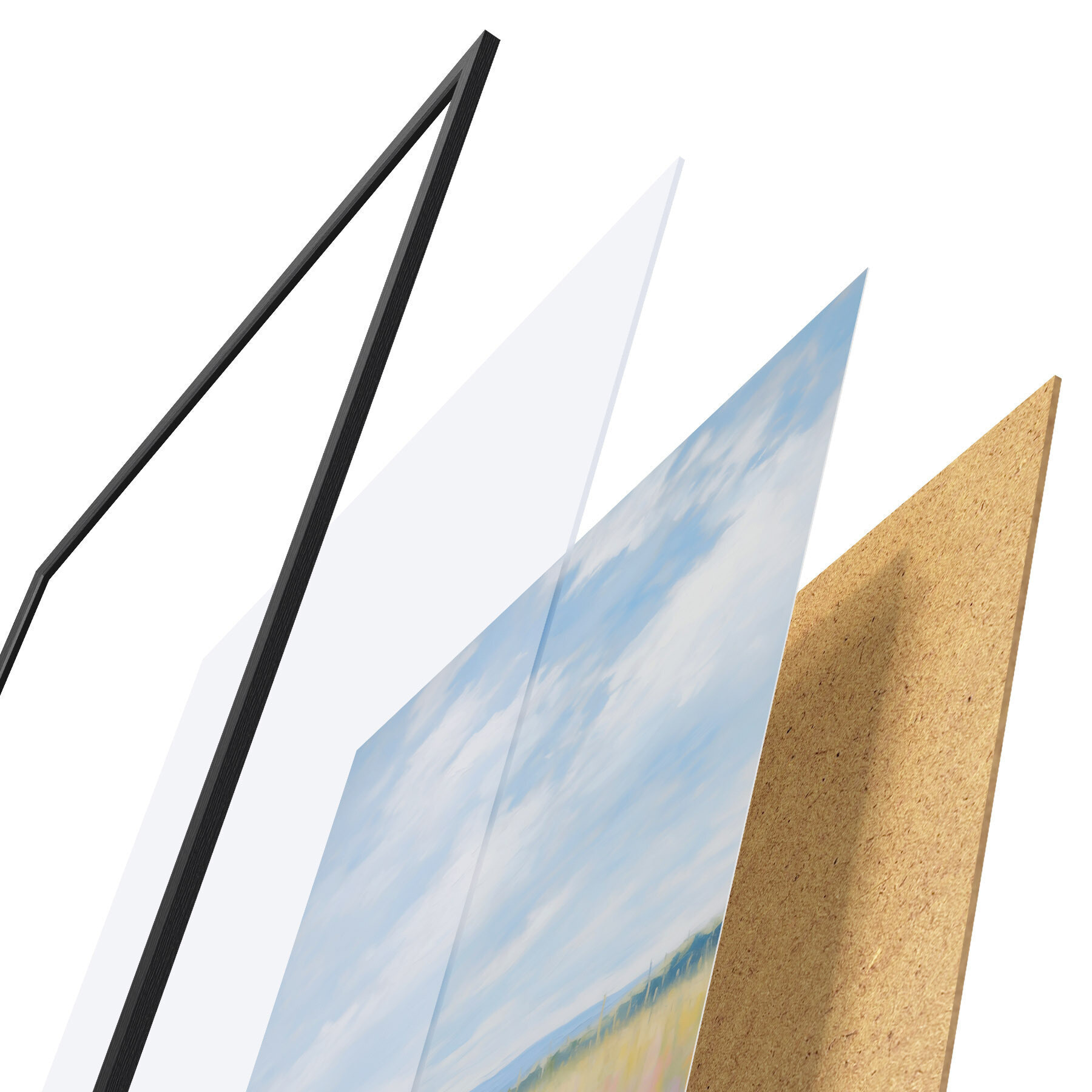 L’affiche encadrée est composée d’un cadre, d’un plexiglas, d’une image imprimée et d’un support en aggloméré. Elle est prête à être accrochée au mur grâce aux fixations situées à l’arrière.