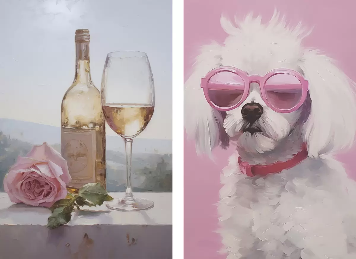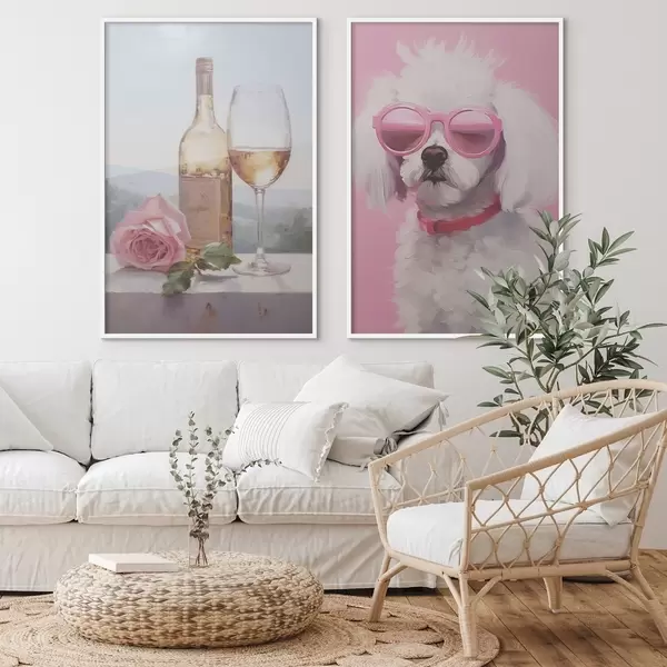Poster Une bouteille, un verre de vin et un caniche portant des lunettes, peinture imitation Nr d01021