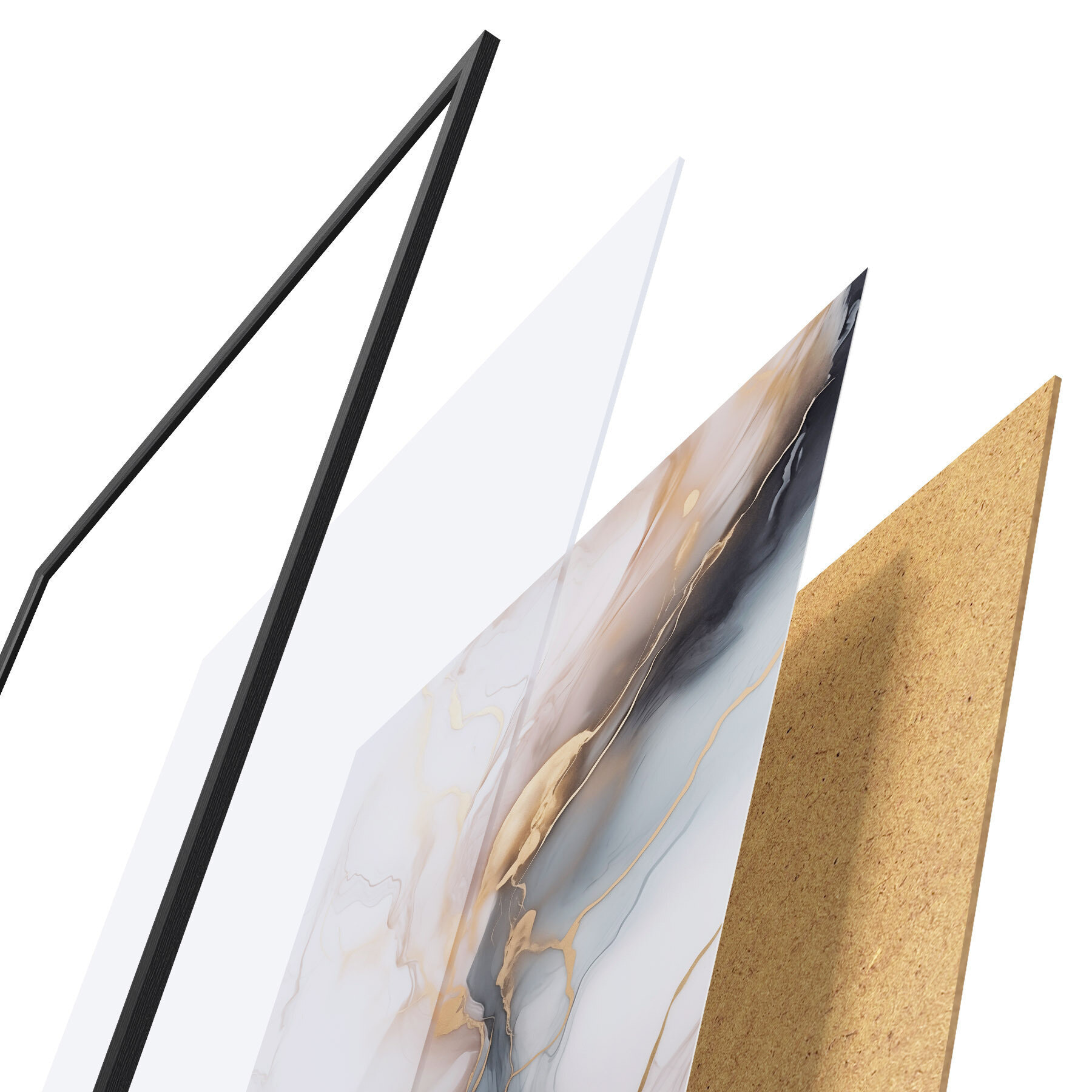 L’affiche encadrée est composée d’un cadre, d’un plexiglas, d’une image imprimée et d’un support en aggloméré. Elle est prête à être accrochée au mur grâce aux fixations situées à l’arrière.