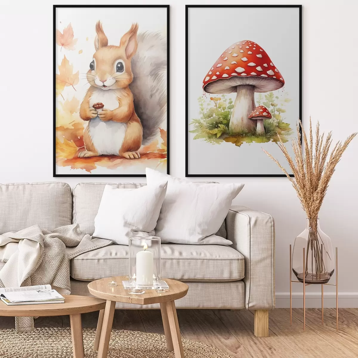 Poster Écureuil et champignon des bois, amanite tue-mouche, imitation aquarelle Nr d01049