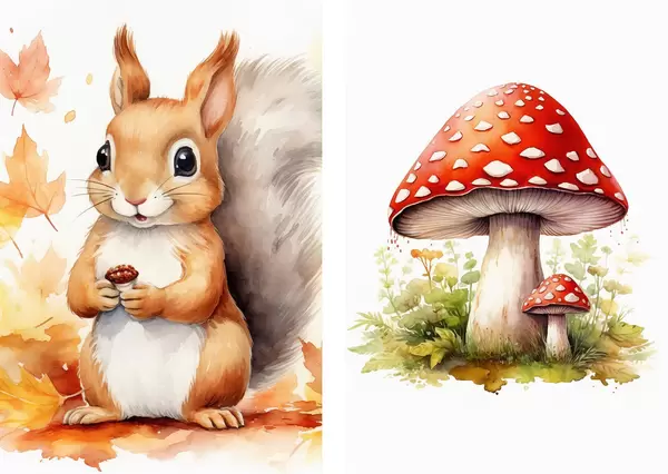 Poster Écureuil et champignon des bois, amanite tue-mouche, imitation aquarelle Nr d01049
