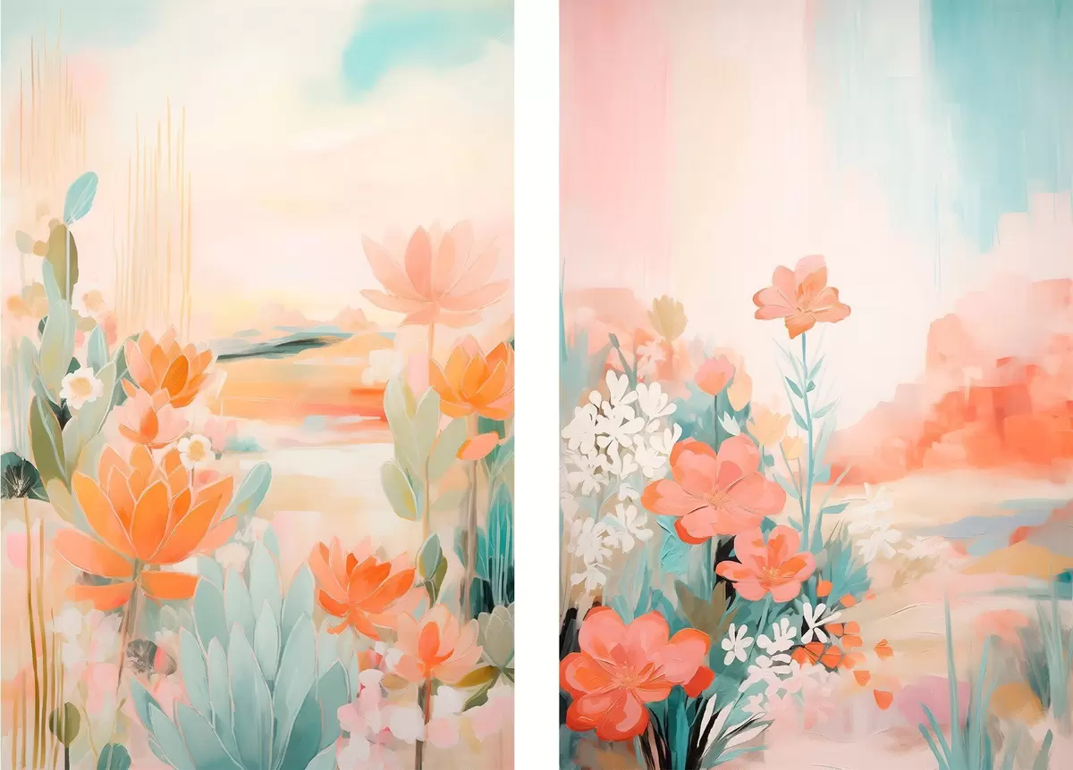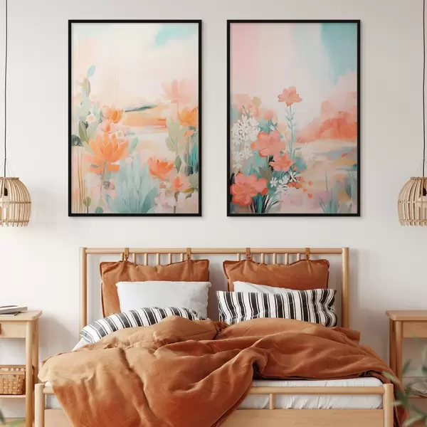 Poster Motifs floraux aux tons pastel sur fond de vallée brumeuse et lumineuse Nr d01085