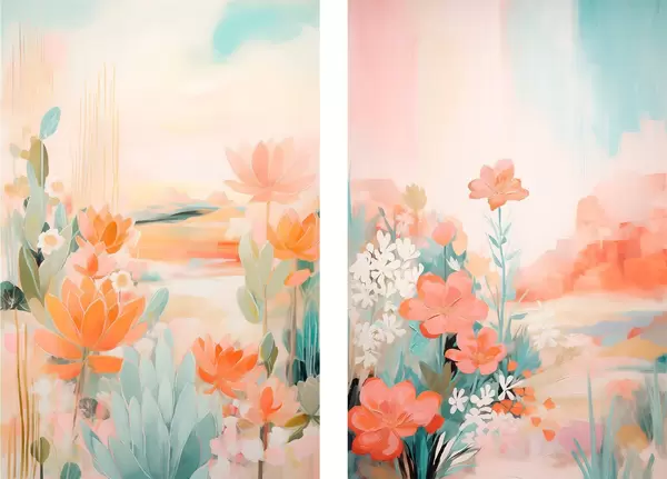 Poster Motifs floraux aux tons pastel sur fond de vallée brumeuse et lumineuse d01085