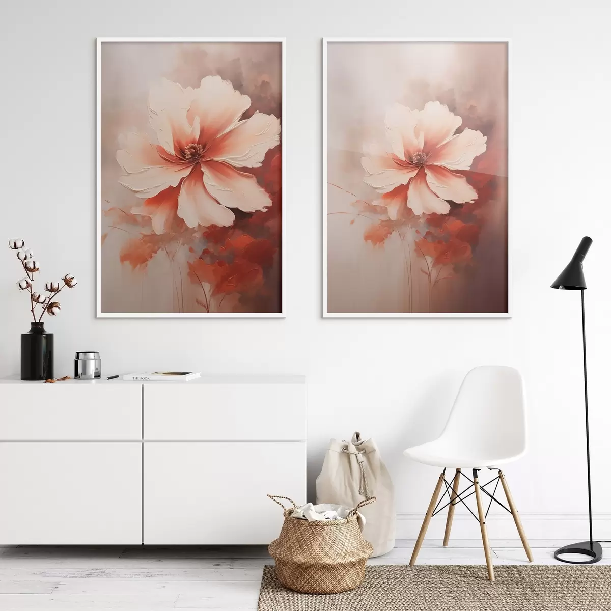 Poster Composition florale : pétales blancs et crème, accents corail et fond brumeux délicat. Nr d01088