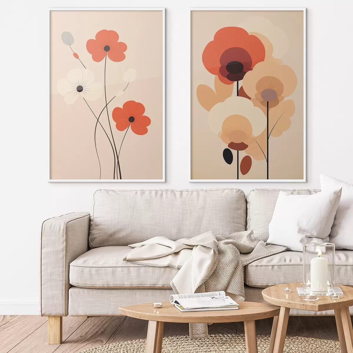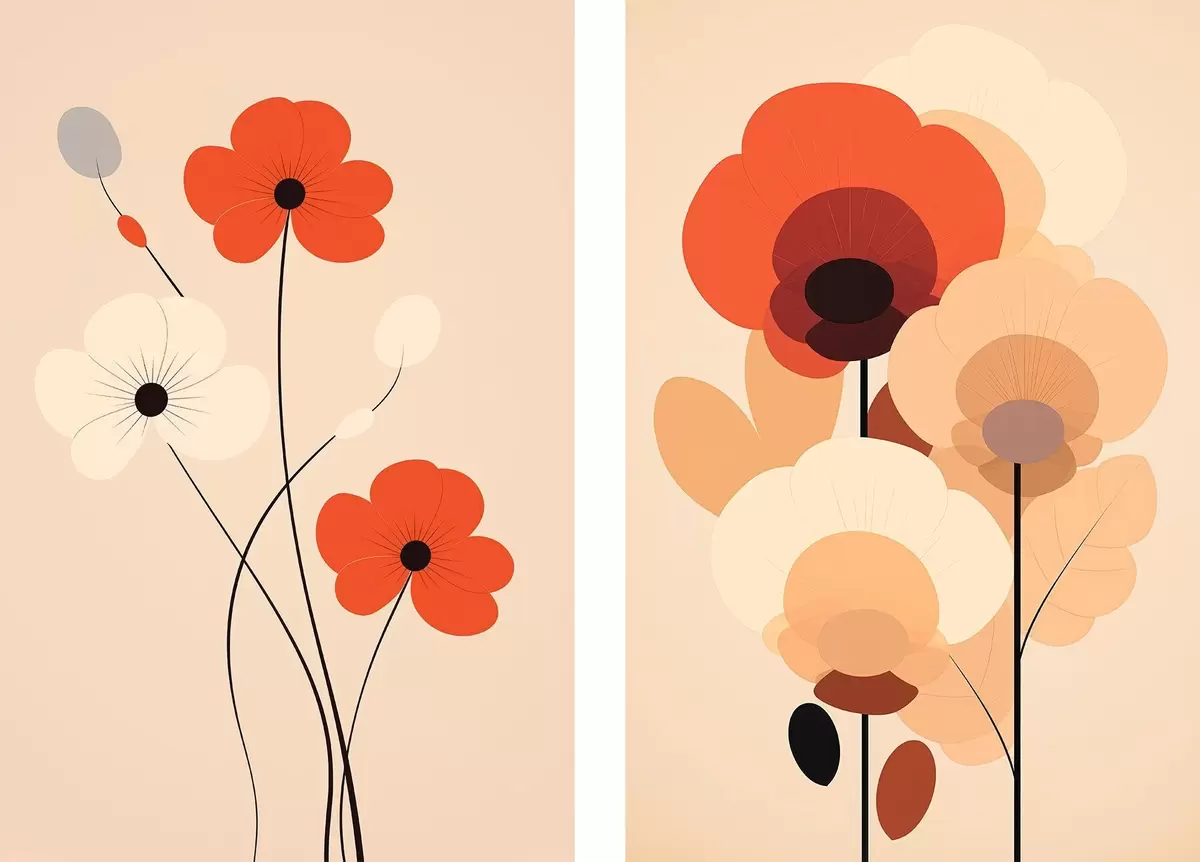 Poster Diptyque floral minimaliste dans des tons chauds beige-corail avec des lignes graphiques d01090