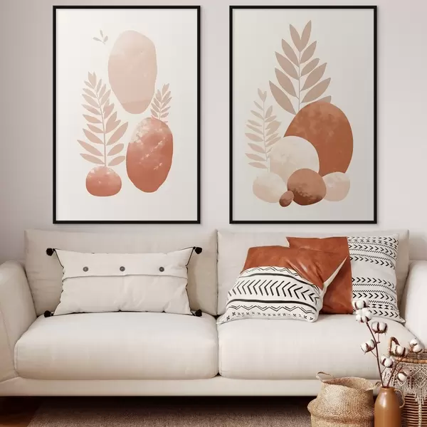 Poster Formes abstraites, pierres texturées et feuilles dans des tons pêche et terre cuite discrets, minimalistes, fond crème. Nr d01114