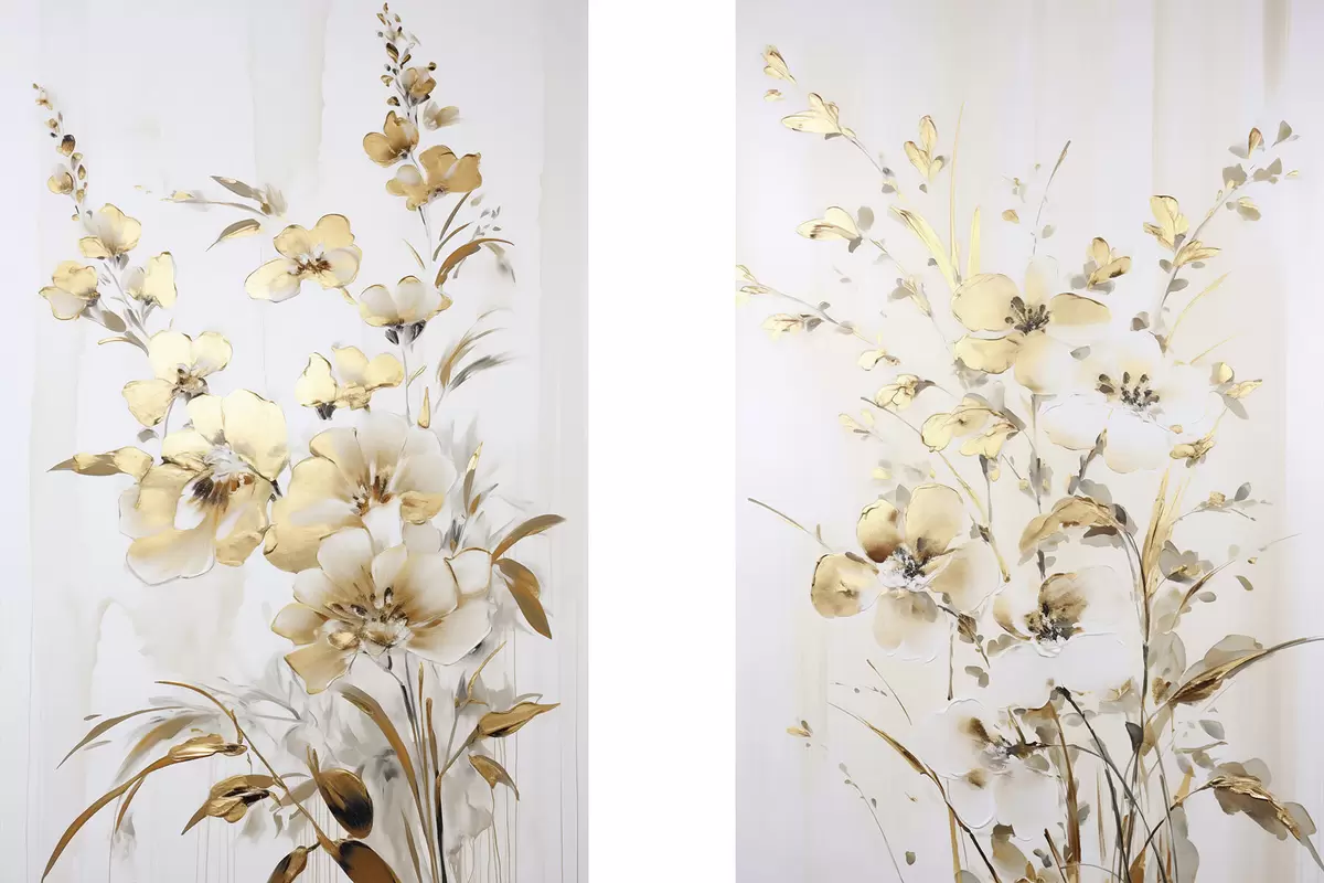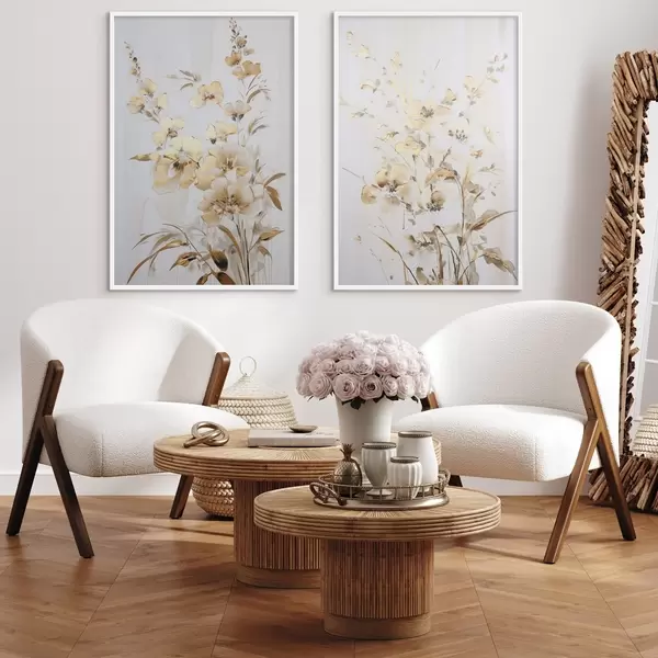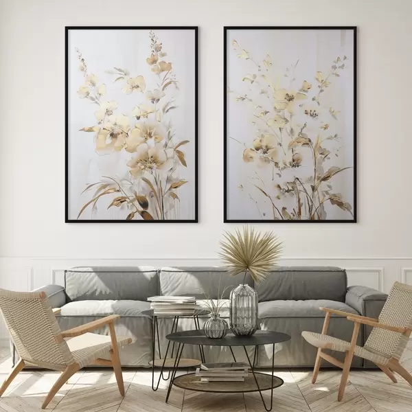 Poster Fleurs et feuilles jaunes texturées sur fond blanc, avec des coups de pinceau délicats Nr d01116