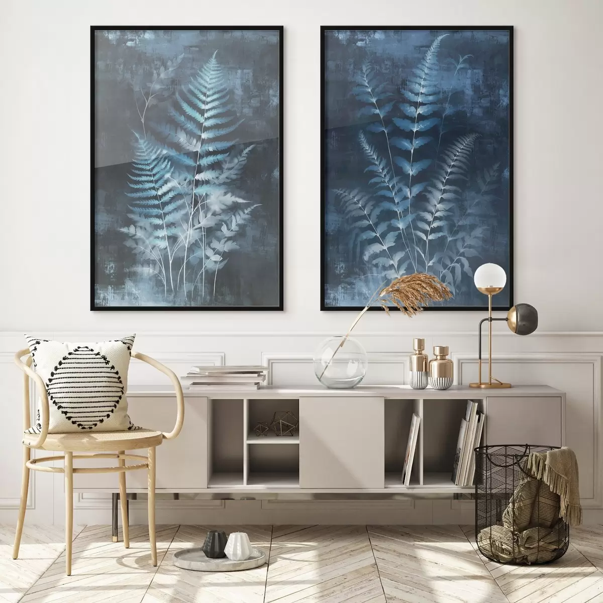 Poster Fougères bleues et plantes sur un fond sombre et texturé, avec un accent sur les détails complexes, effet rayons X. d01121