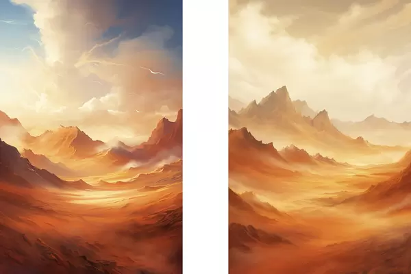 Poster Un vaste paysage désertique orange avec des montagnes rocheuses imposantes sous un ciel brumeux et ensoleillé, parsemé de nuages vaporeux. Nr d01122