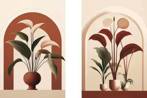 Poster Plantes en pot abstraites avec de grandes feuilles vertes et rouges devant une arche de couleur crème. d01124