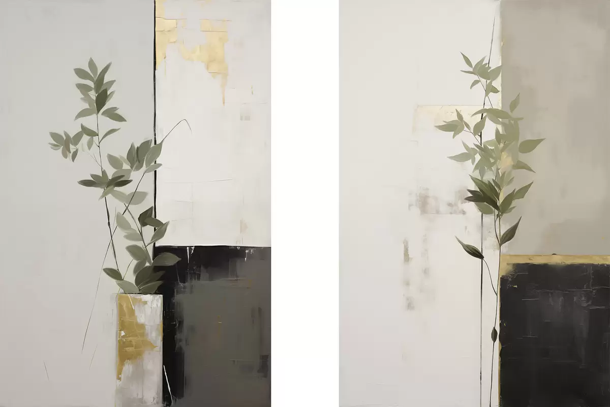 Poster Une peinture minimaliste texturée représentant un vase avec des feuilles vertes sur fond de formes géométriques abstraites. Nr d01126
