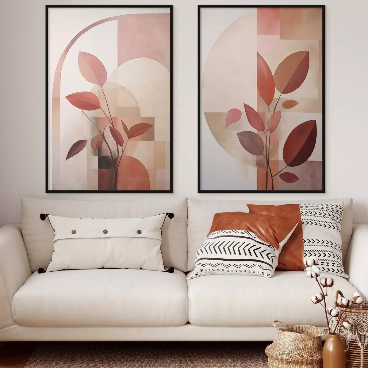 Poster Plante abstraite aux feuilles rouges sur fond de formes géométriques et de couleurs douces et discrètes d01128