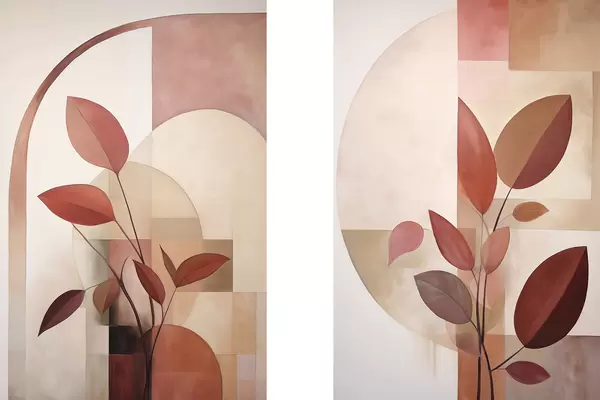 Poster Plante abstraite aux feuilles rouges sur fond de formes géométriques et de couleurs douces et discrètes Nr d01128
