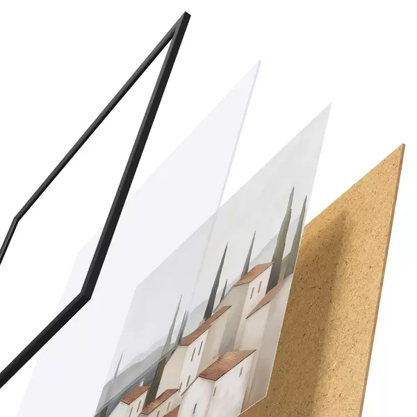 L’affiche encadrée est composée d’un cadre, d’un plexiglas, d’une image imprimée et d’un support en aggloméré. Elle est prête à être accrochée au mur grâce aux fixations situées à l’arrière.