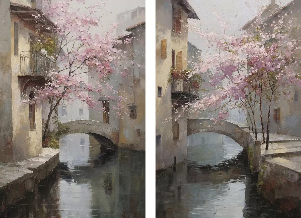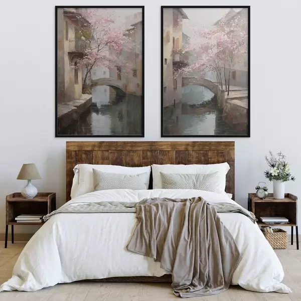 Poster paysage urbain romantique avec un arbre en fleurs dans le style d'une peinture à l'huile d01173