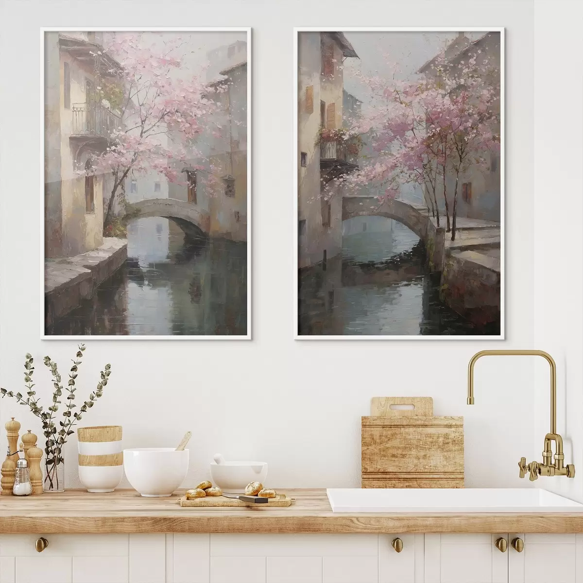 Poster paysage urbain romantique avec un arbre en fleurs dans le style d'une peinture à l'huile Nr d01173