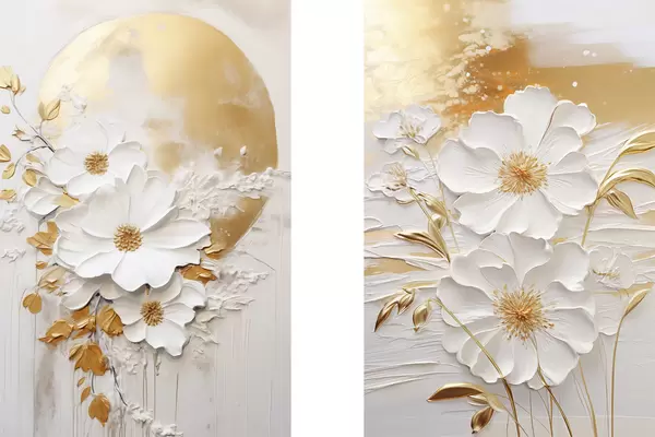 Poster Fleurs blanches rehaussées de touches jaunes et feuilles délicates sur fond texturé, art moderne d01233