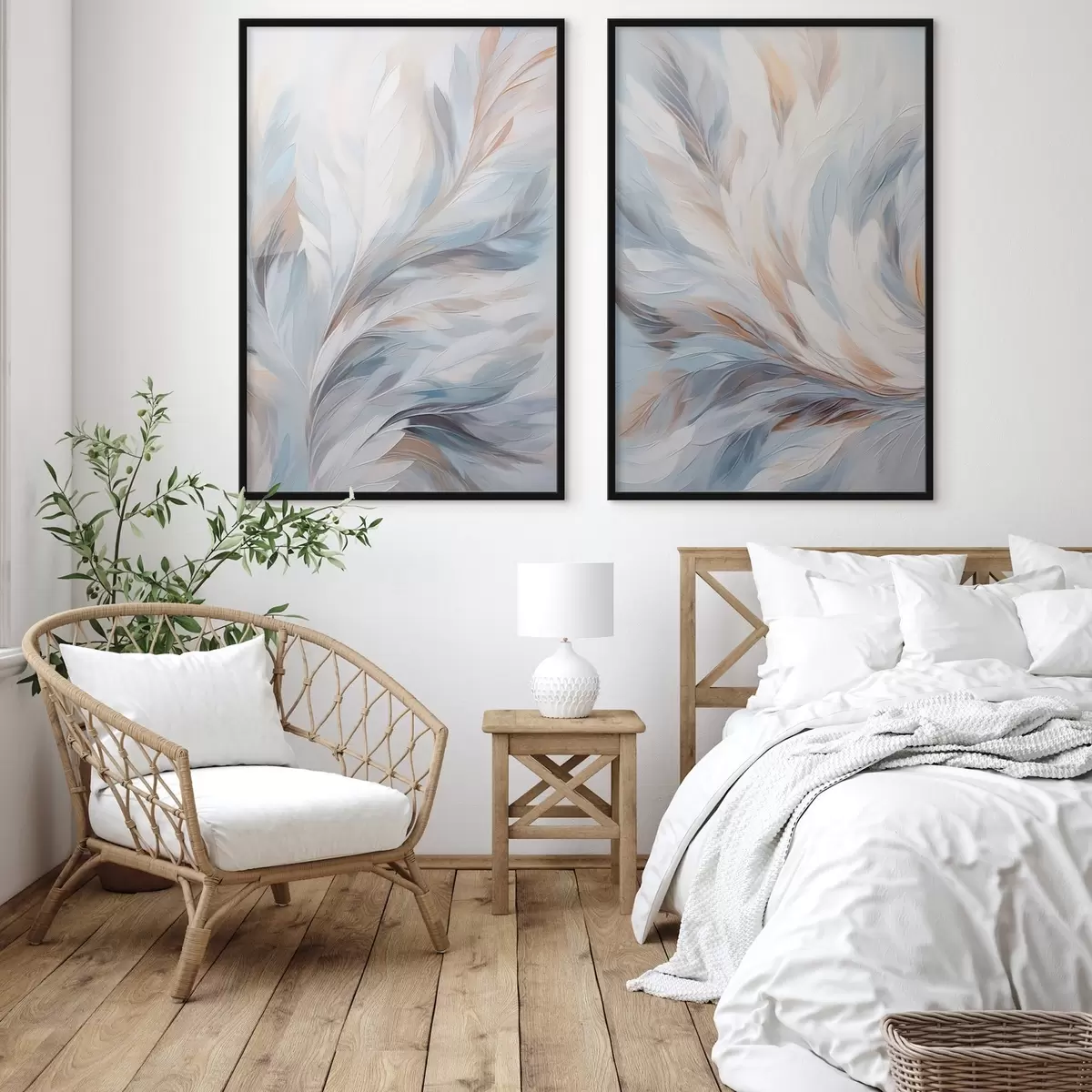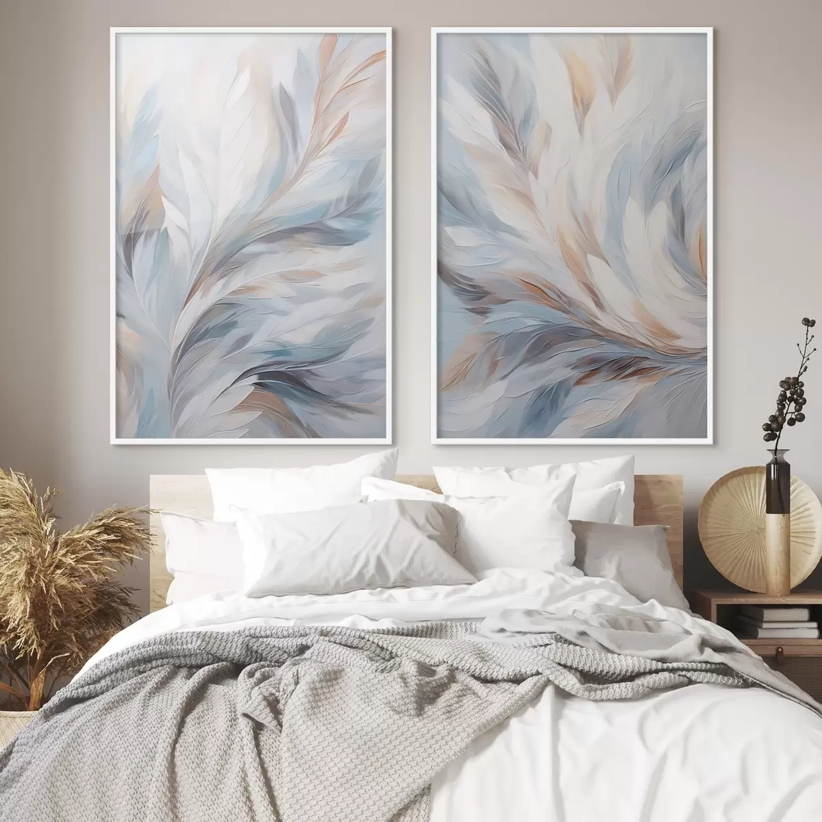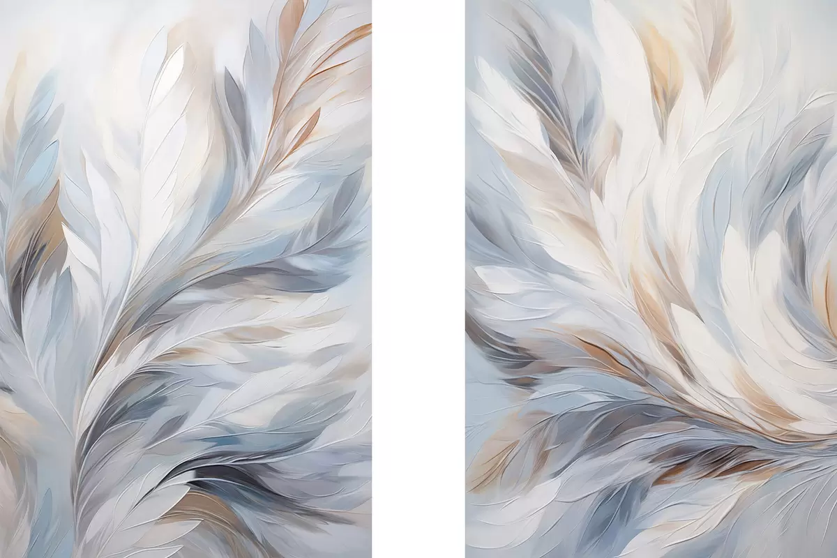 Poster Peinture abstraite représentant des plumes dans des tons blancs, bleus et bruns, avec une texture douce et fluide et un fond clair. Nr d01234