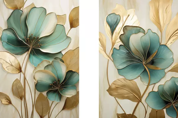 Poster Grandes fleurs bleu sarcelle et jaunes avec contours, entourées de feuilles jaunes sur fond abstrait Nr d01235