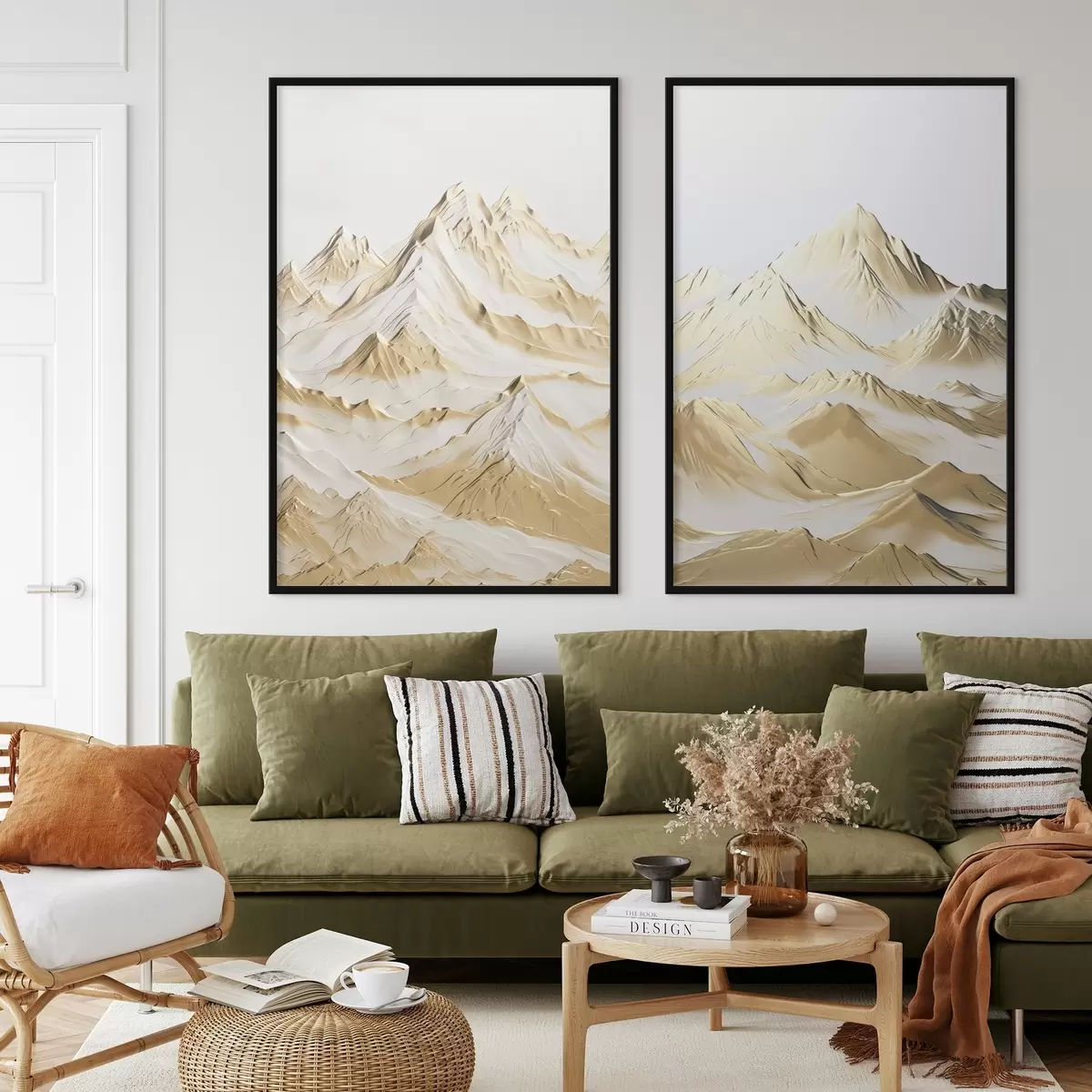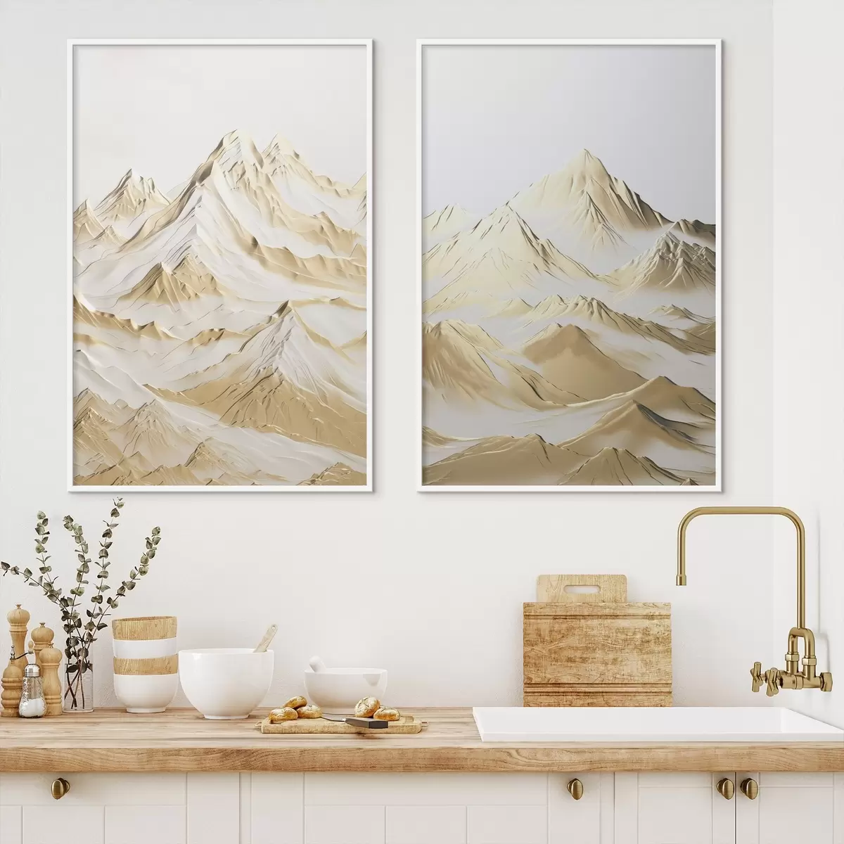 Poster Un paysage de montagnes jaunes enneigées aux pics acérés et aux vallées profondes sous un ciel clair. d01236