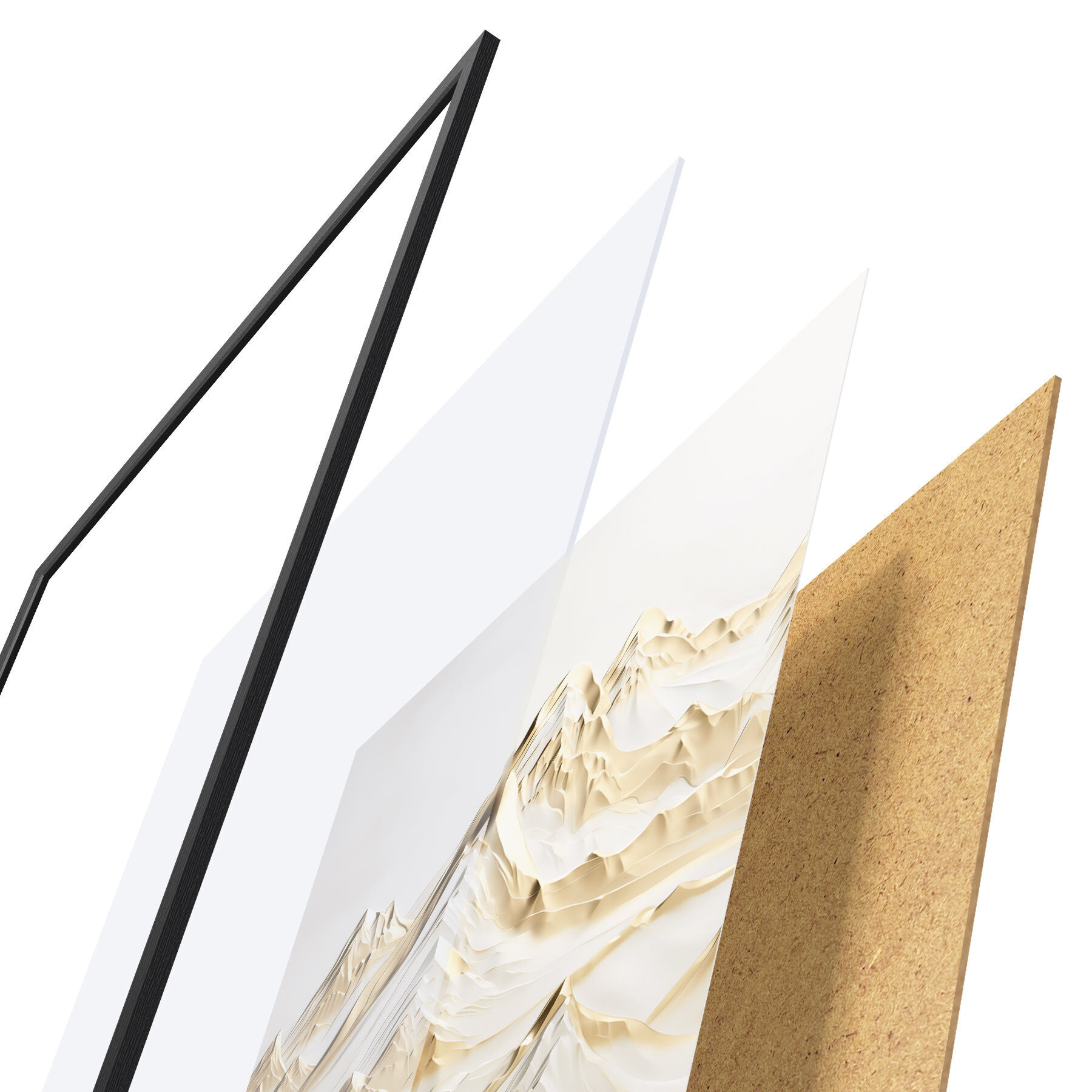 L’affiche encadrée est composée d’un cadre, d’un plexiglas, d’une image imprimée et d’un support en aggloméré. Elle est prête à être accrochée au mur grâce aux fixations situées à l’arrière.