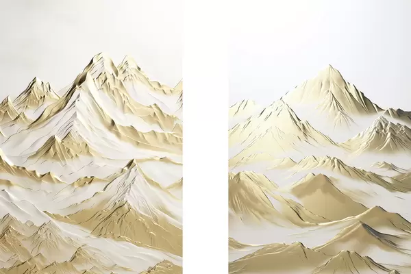 Poster Un paysage de montagnes jaunes enneigées aux pics acérés et aux vallées profondes sous un ciel clair. d01236