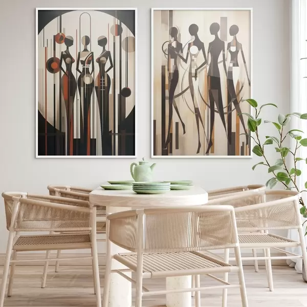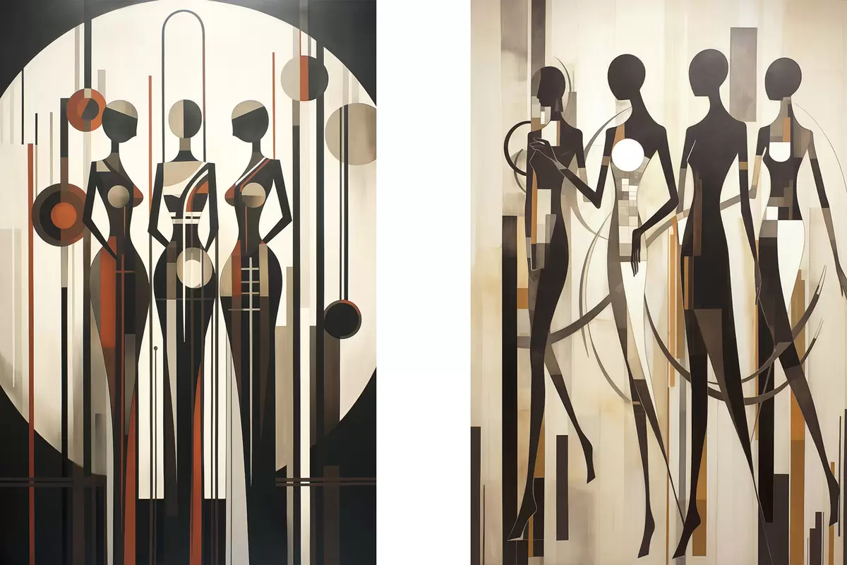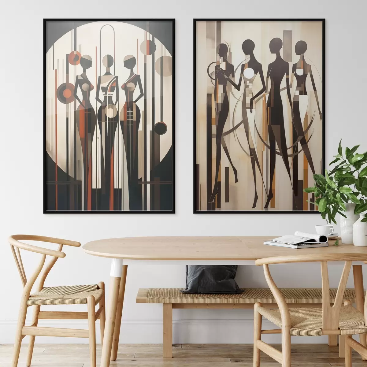 Poster Figures féminines stylisées avec des éléments géométriques sur un fond abstrait composé de lignes verticales et de cercles. d01237