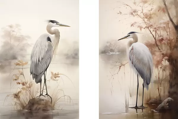 Poster Un héron se tient sur un rocher dans un lac, avec de hautes herbes et des arbres en arrière-plan. Nr d01239