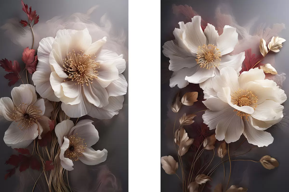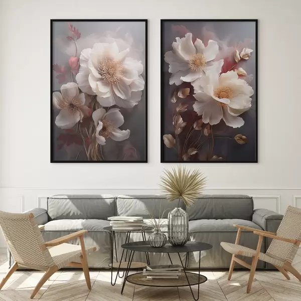 Poster Pivoines délicates aux pétales fins et vaporeux, entourées de feuilles rouge foncé et jaunes sur fond abstrait. Nr d01243