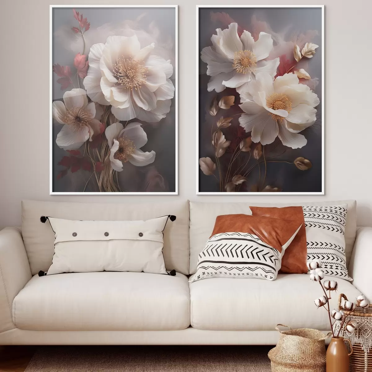 Poster Pivoines délicates aux pétales fins et vaporeux, entourées de feuilles rouge foncé et jaunes sur fond abstrait. d01243